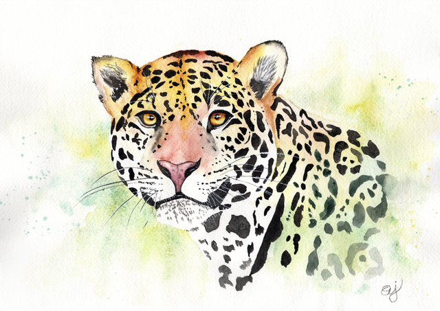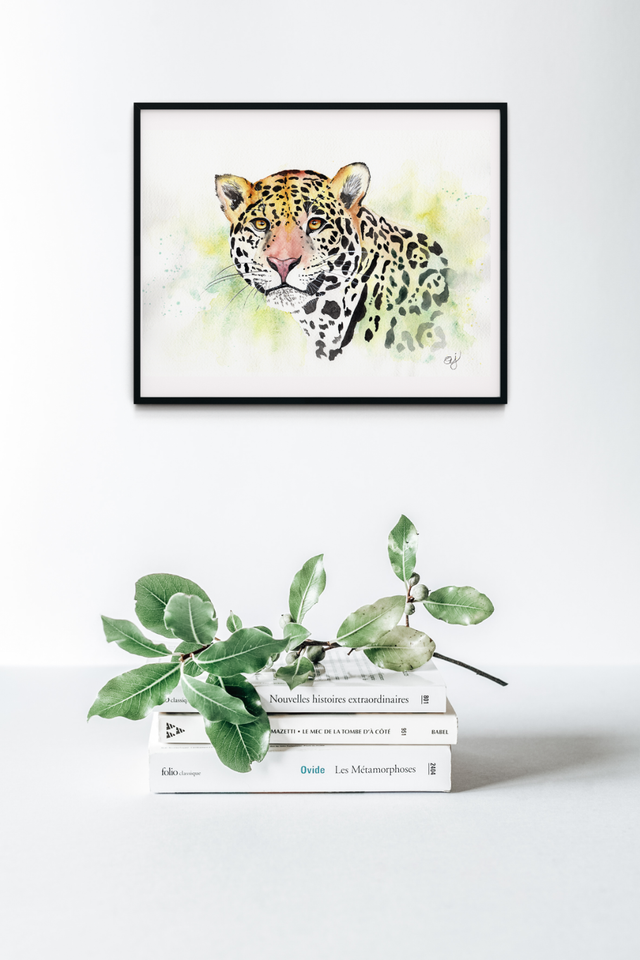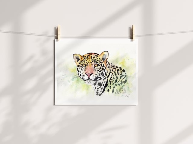 Masters of camouflage, jaguars blend seamlessly into their forested habitats, their distinctive rosette patterns offering both beauty and concealment. Bring a fresh splash of color and a touch of the wild into your favorite space with this captivating, loose watercolor painting.