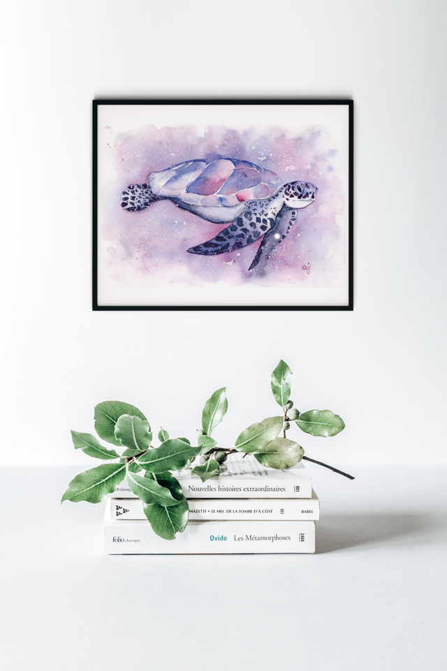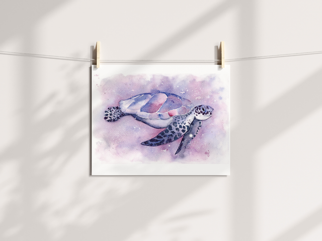 Lose yourself in the beauty of the ocean with this watercolor painting of a sea turtle. Gliding gracefully through the water, the turtle's movements are fluid and dreamlike, embodying simple elegance. This artwork brings a touch of aquatic tranquility and dreamy charm to your favourite space, perfect for creating a soothing atmosphere wherever you want.
